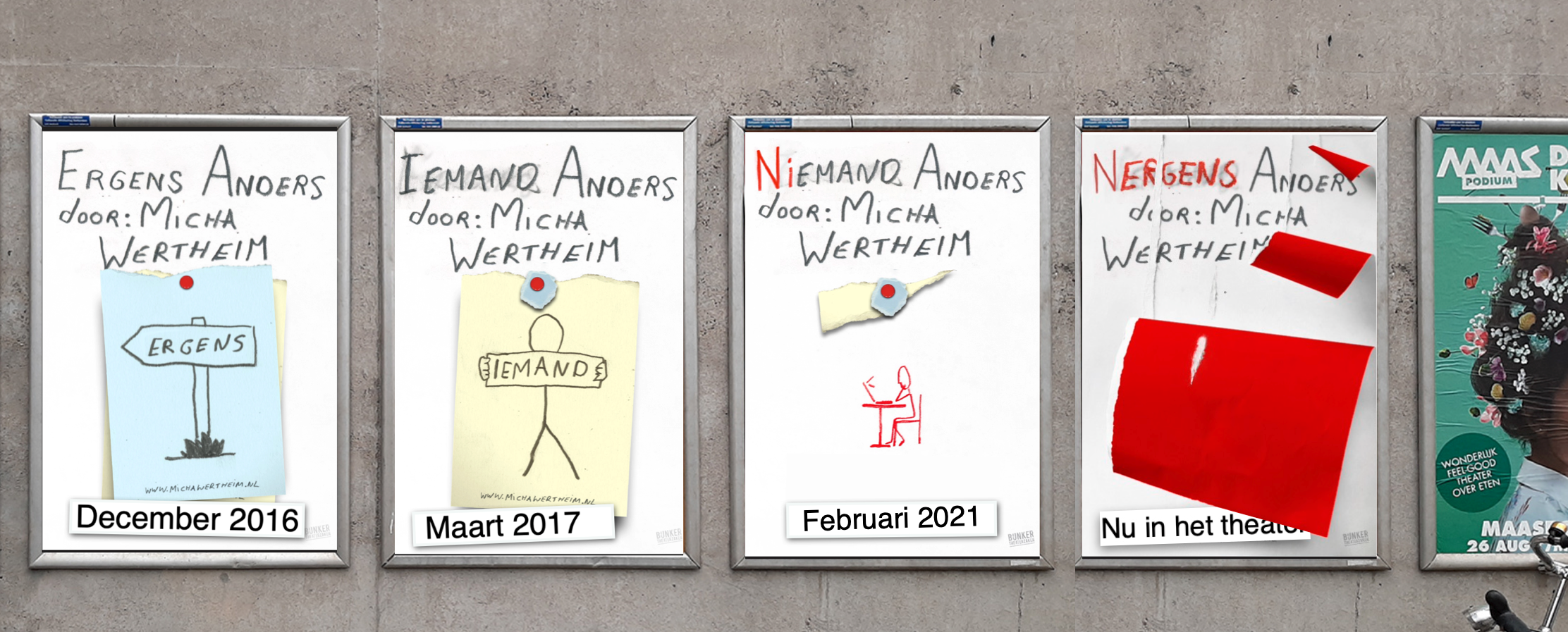 Tussen het maken van cabaretvoorstellingen en het schrijven van columns door heeft Micha Wertheim soms behoefte om iets anders te doen. Zo maakte hij ooit een voorstelling waarin het publiek het zonder hem moest doen (Ergens Anders). Daarna was er een voorstelling over een robot die in therapie ging bij het publiek (Iemand Anders), in coronatijd ontstond zo de veelgeprezen online voorstelling waar geen publiek bij was (Niemand anders). En nu, een jaar na zijn oudejaarsconference, gaat Micha de kleine zalen in met het vierde deel van deze trilogie: Nergens Anders. Verwacht geen comedy of cabaret, maar iets wat je nergens anders mee zal maken.